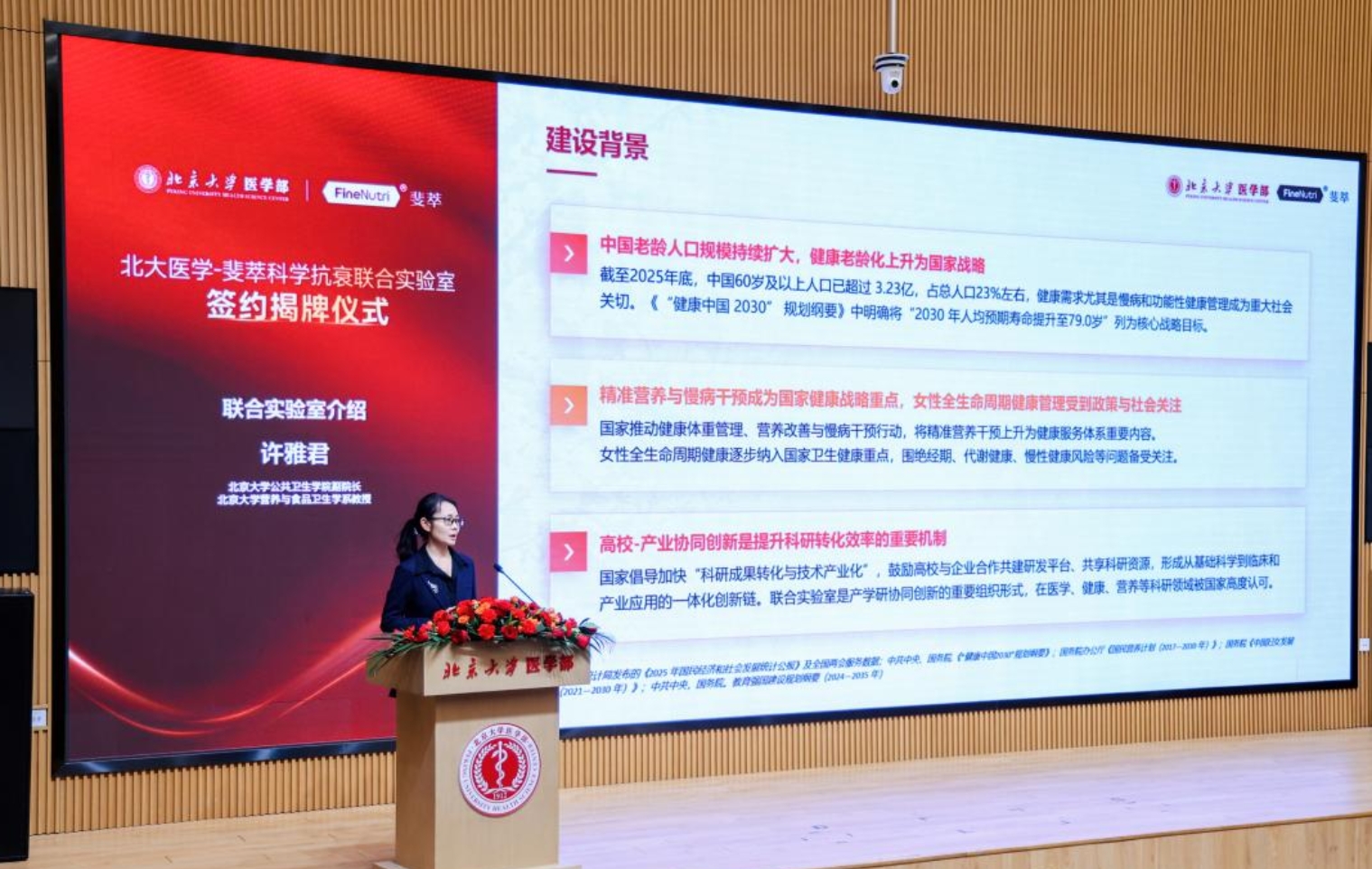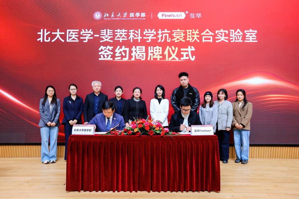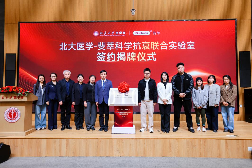 为深入贯彻落实健康中国战略,助力科学抗衰产业规范化、高质量发展,3月20日,北京大学医学部与FineNutri斐萃共建“北大医学-斐萃科学抗衰联合实验室”签约揭牌仪式在北京大学医学科技楼报告厅顺利举行。双方将以精准营养为核心切入点,深化产研协同创新,携手为中国科学抗衰产业发展树立新标杆。北京大学医学部副主任肖渊,北京大学公共卫生学院院长詹思延、北京大学公共卫生学院副院长、联合实验室主任许雅君,斐萃(广州)商务服务有限公司事业部总经理赵凤鸣等双方代表出席活动。仪式由北京大学公共卫生学院副院长任涛主持。
